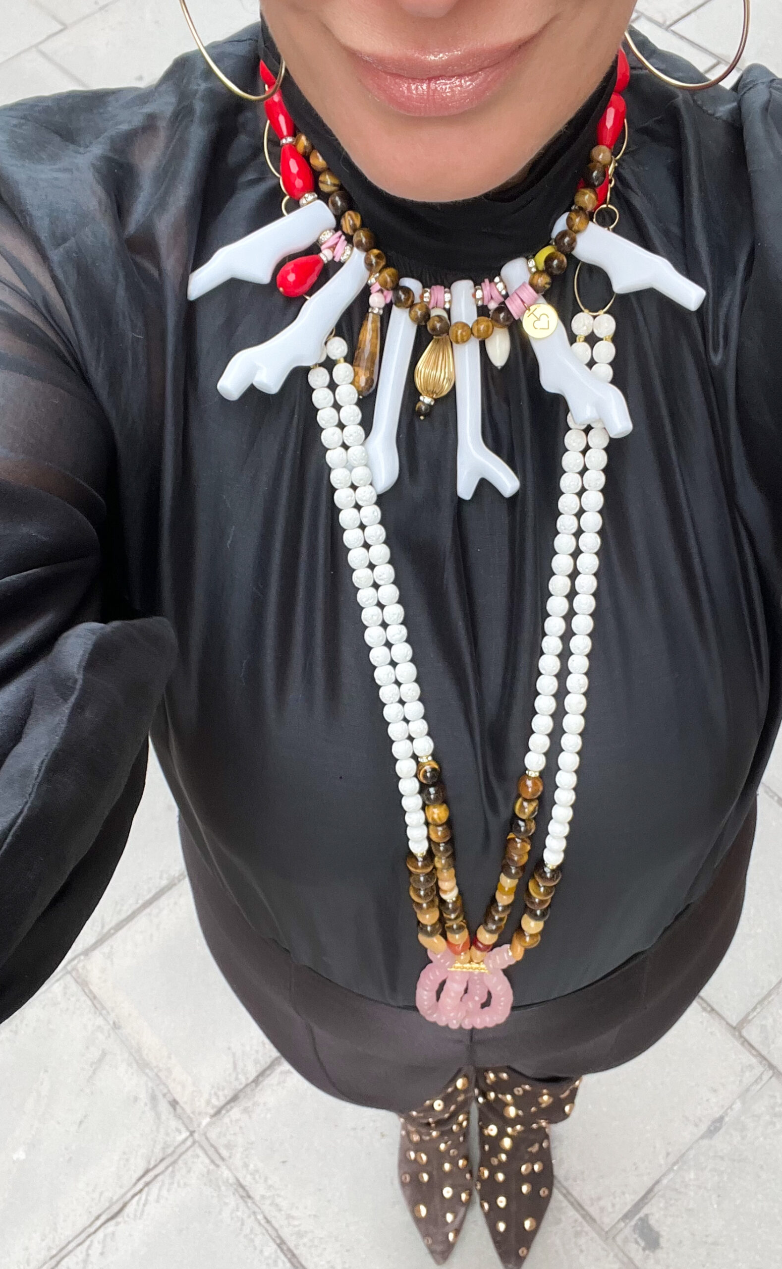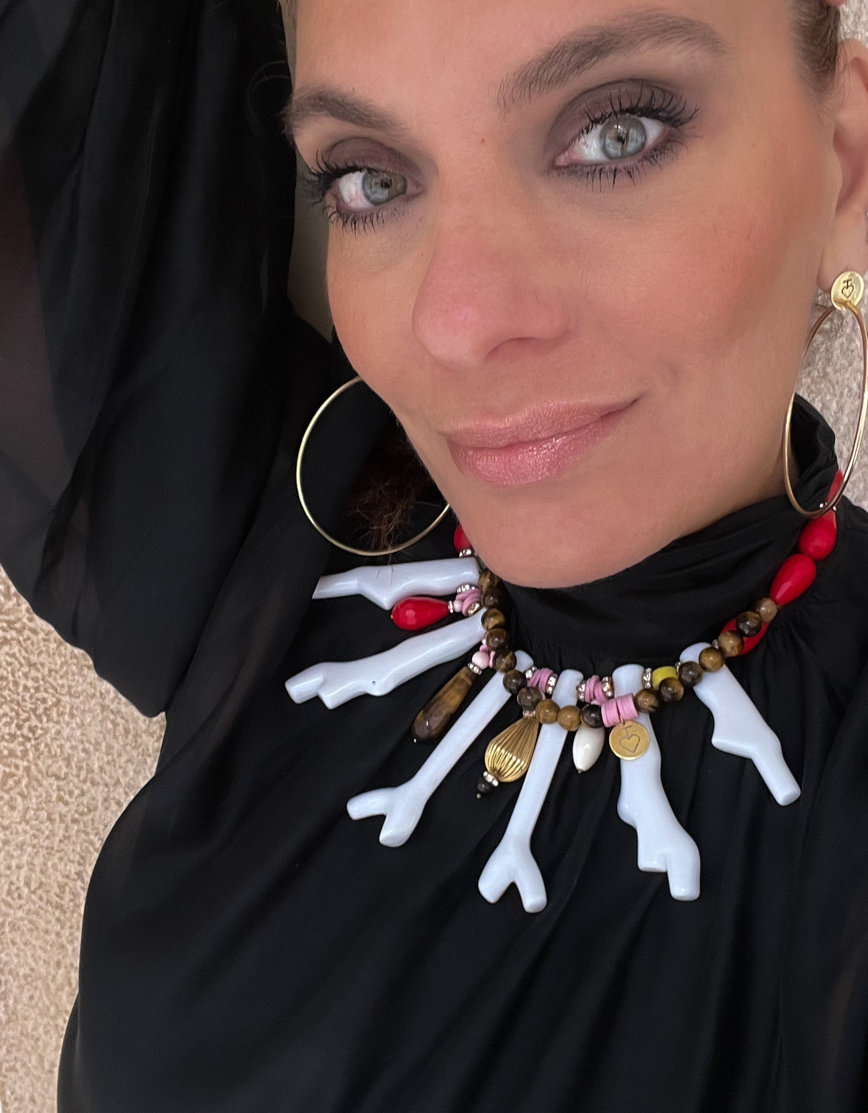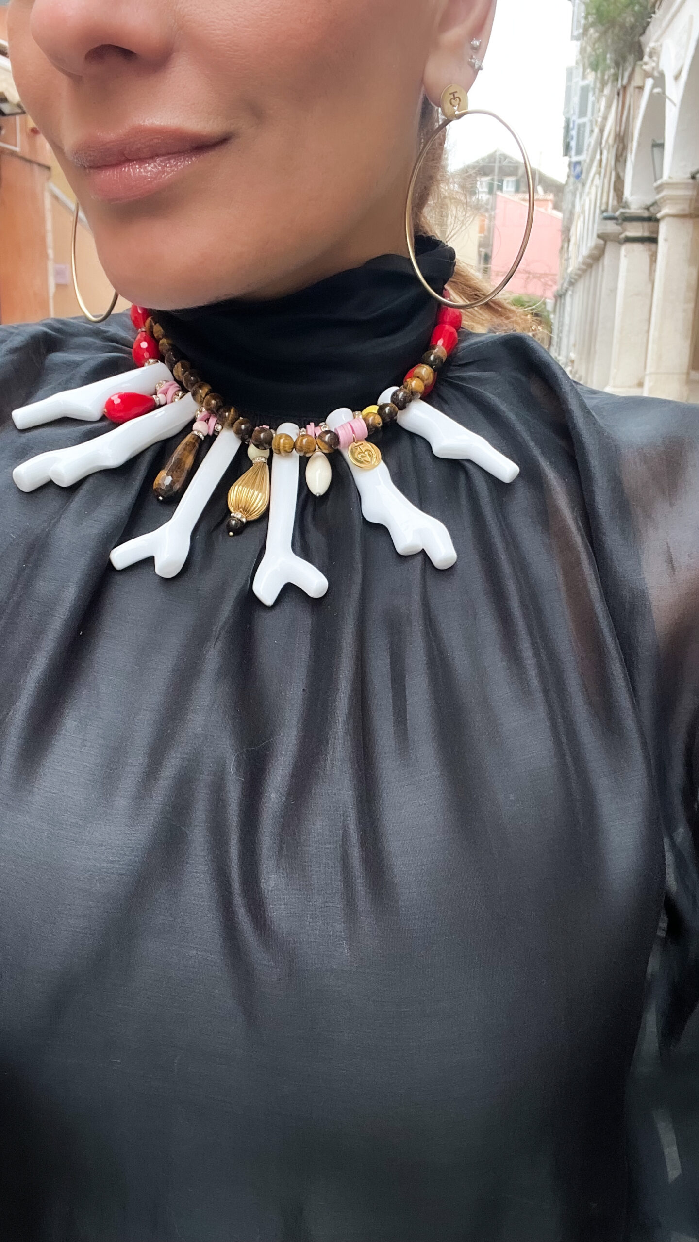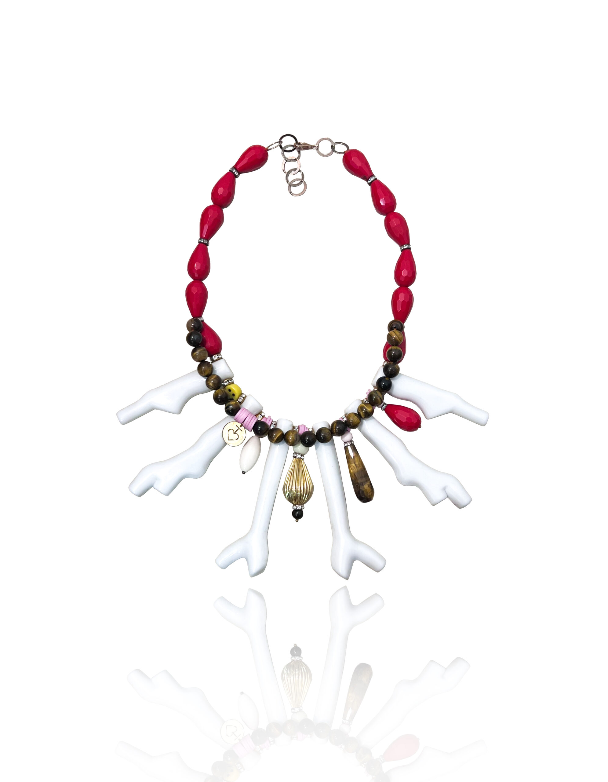 The Ocean Lux collection features handcrafted statement necklaces designed to make an impression. Organic coral shapes in white resin blend harmoniously with deep blues, turquoise, red and tiger eye accents and other natural stones creating a sophisticated yet vibrant aesthetic.